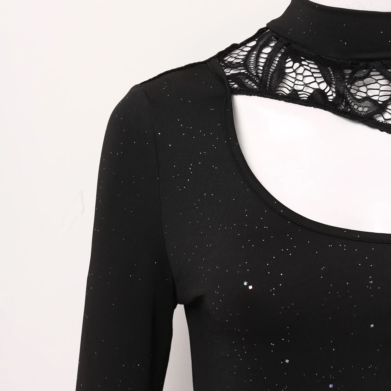 2024 Women’s Elegant Wrap Hip Dress Fashion Glitter High Neck Sexy Lace Hollow Knit Fabric Long Sleeve Mini Party Dress Female Saim Tex