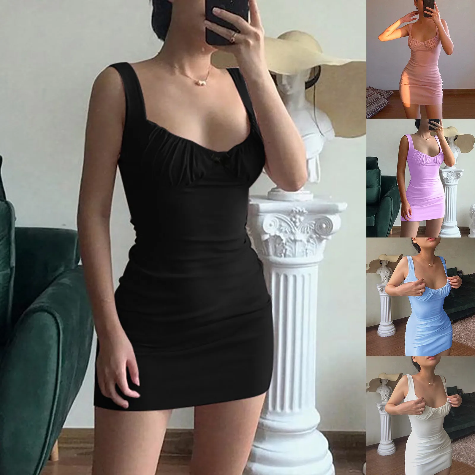 Style: unique design, sleeveless, crew neck, above knee length, ribbed tank top dress, ruched dress, plain/solid color, stretchy mini dress, casual short dress, slim fit, elegant chic style