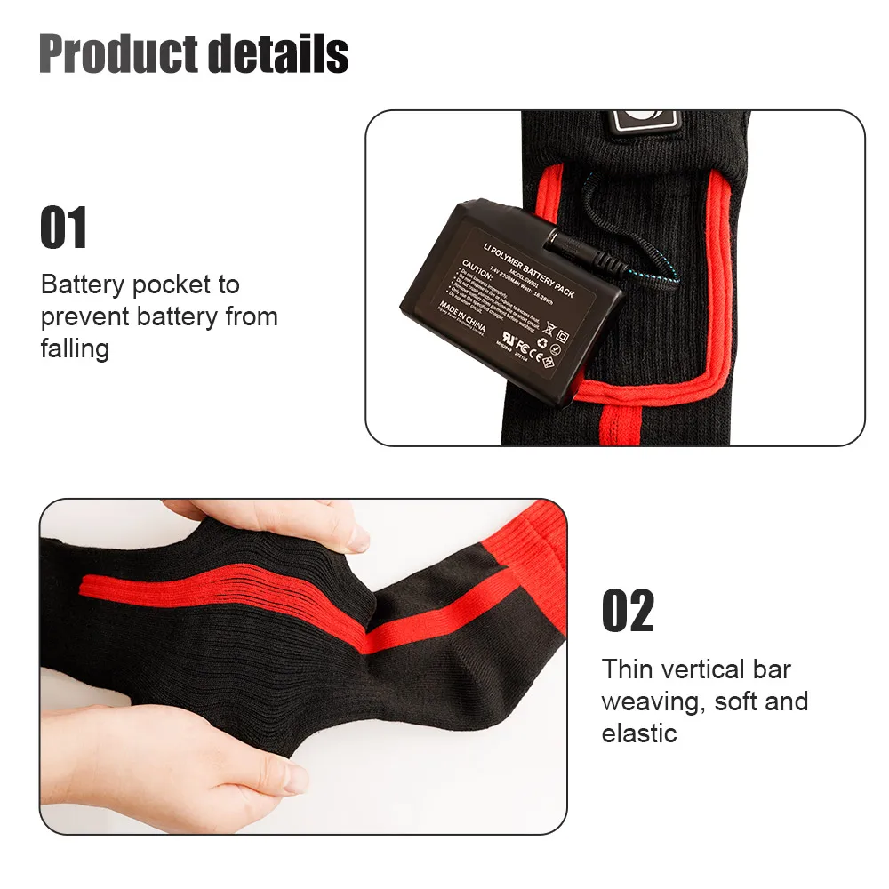 [high quality imported materials]Â this winter sock has a long service life and is equipped with a 7.4v UL / CE certified 2200mAh lithium ion rechargeable battery. It adopts high-quality materials and dual cable charging system, which can charge the battery at the same time and facilitate the removal of the battery.