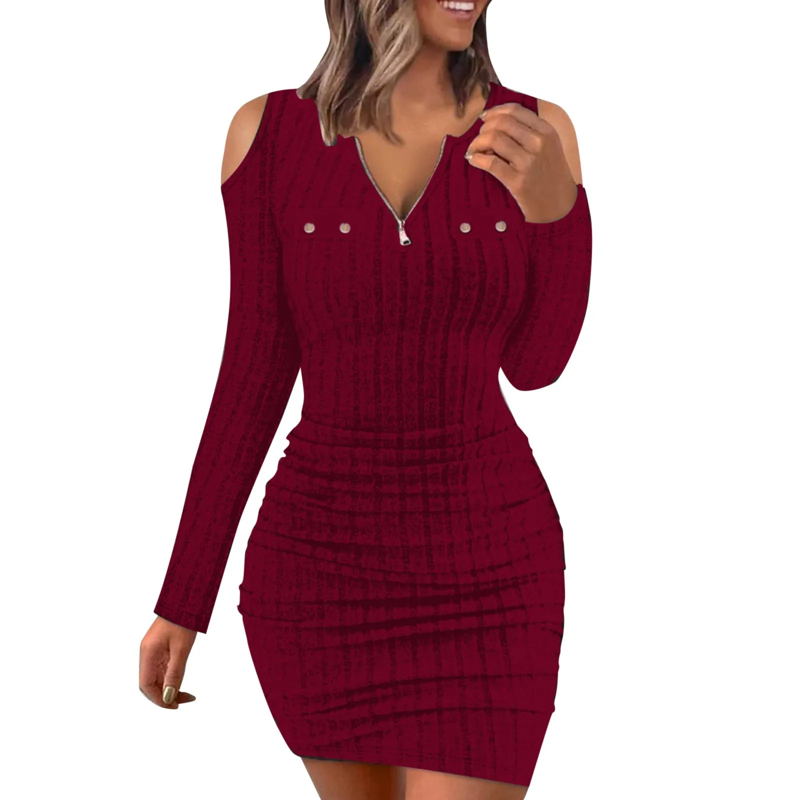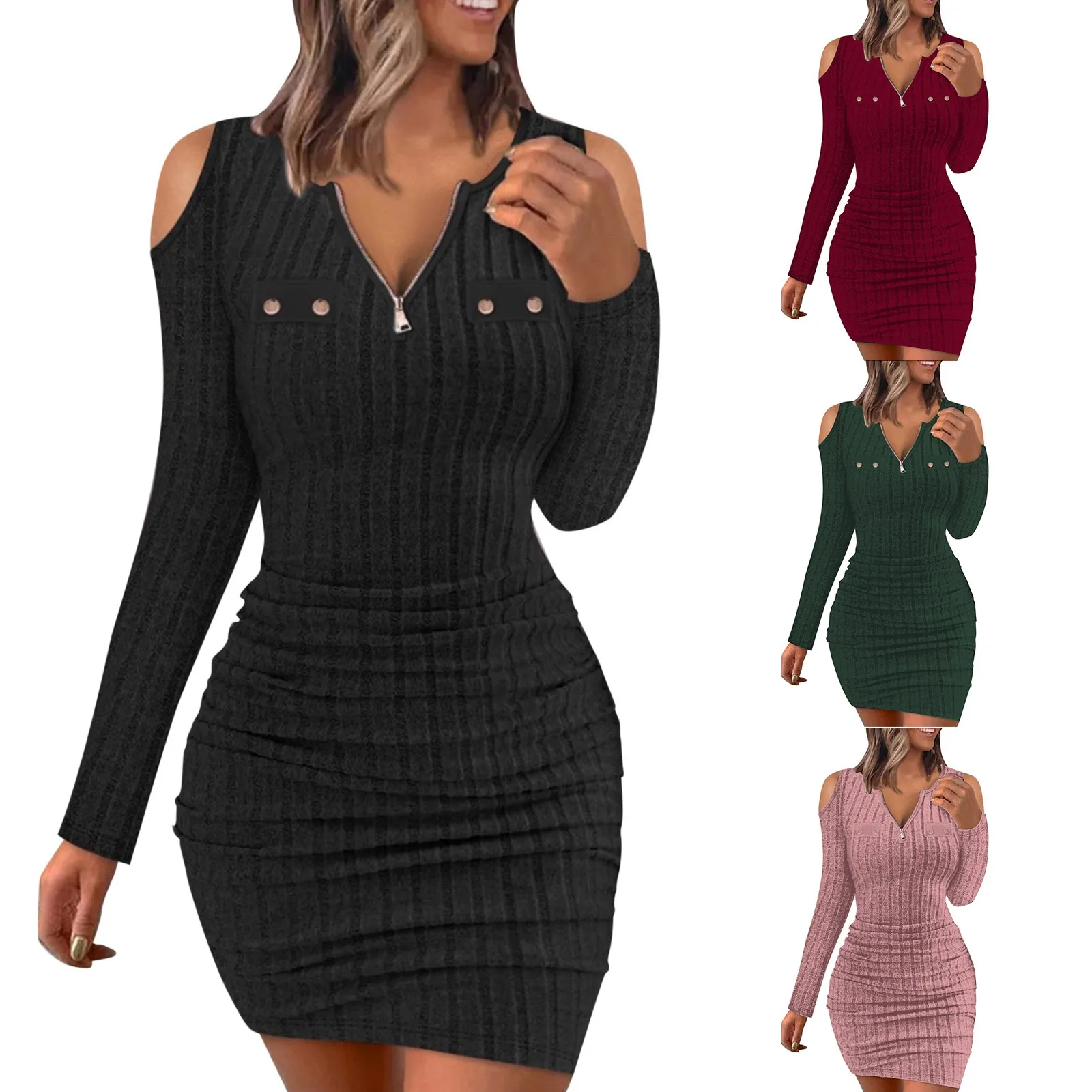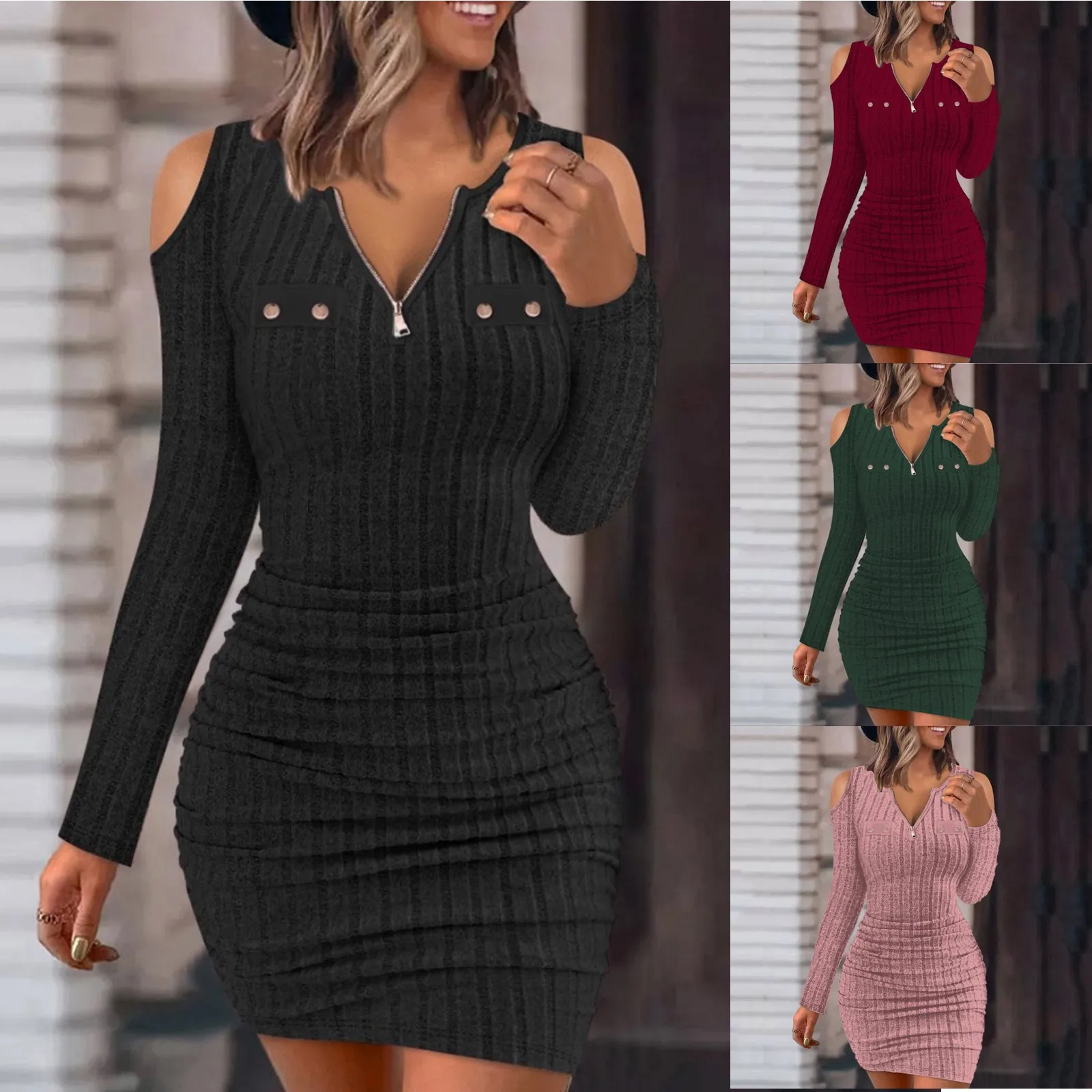 Women Autumn Winter Knit Dress Solid Cold Shoulder Long Sleeve Front Zip Tight Sweater Dress Ladies Comfort Mini Dress Vestidos Saim Tex