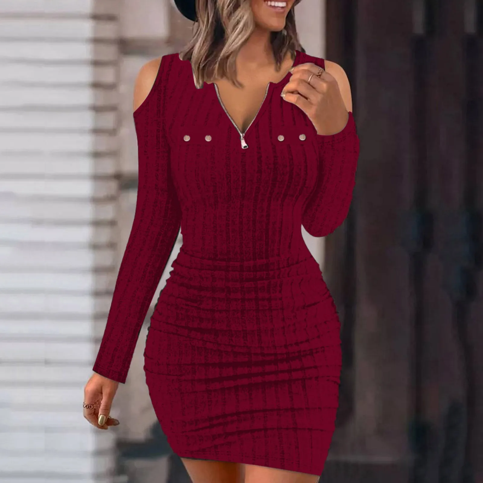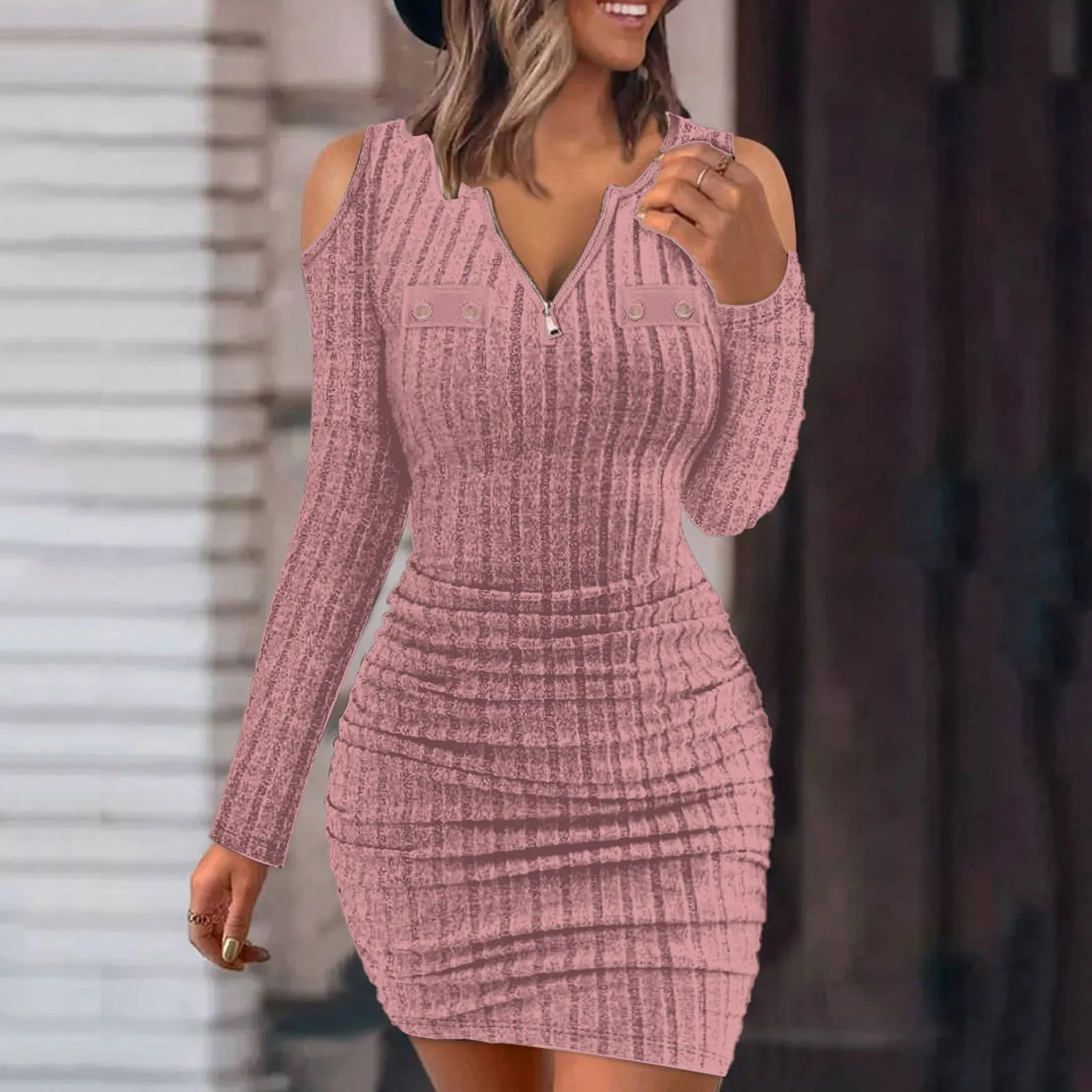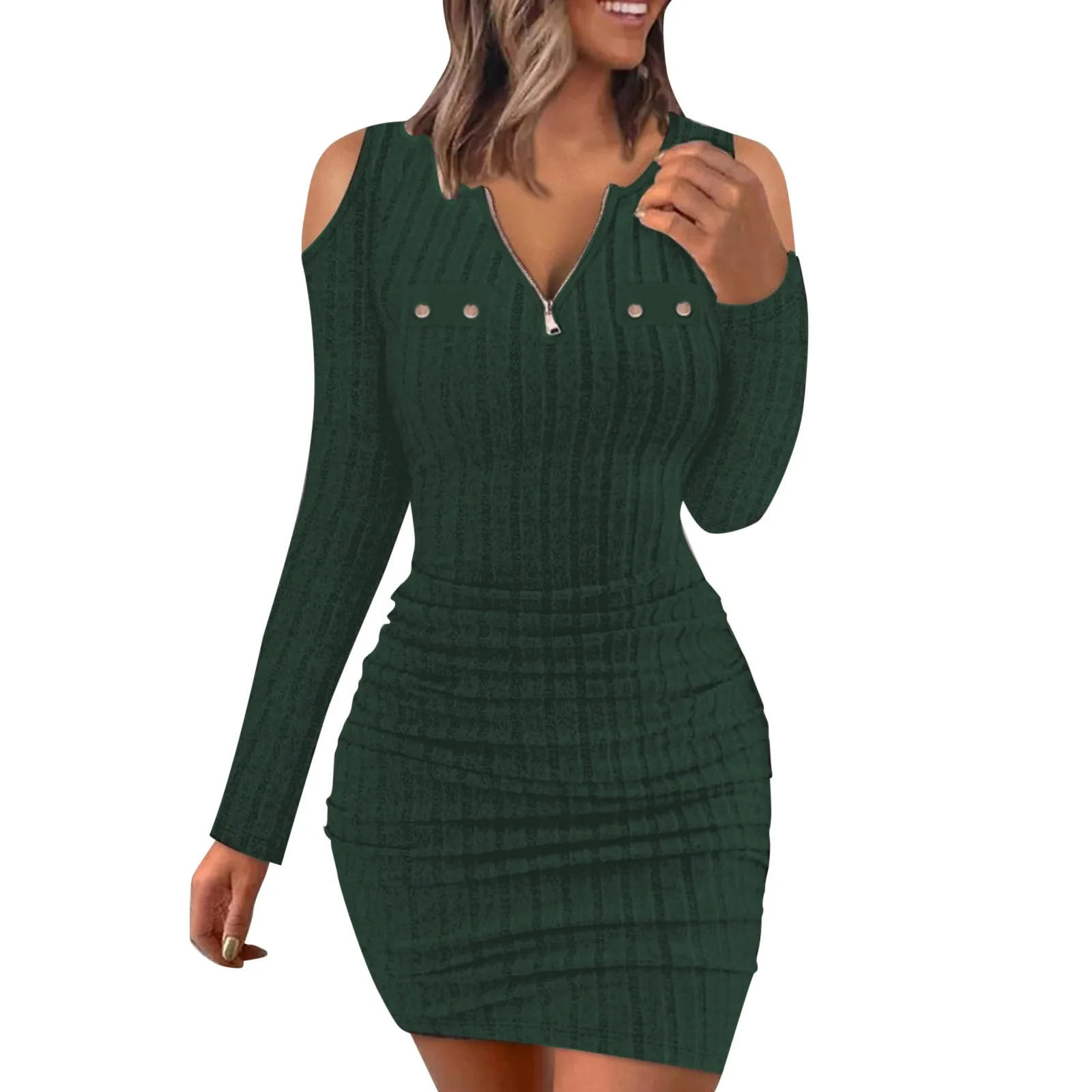 Women Autumn Winter Knit Dress Solid Cold Shoulder Long Sleeve Front Zip Tight Sweater Dress Ladies Comfort Mini Dress Vestidos Saim Tex